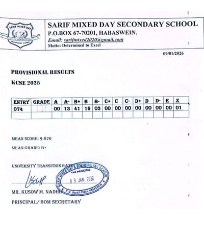 According to the provisional results released on 9th January 2026, Sarif Mixed Day Secondary School presented 74 candidates for the KCSE 2025 examinations.